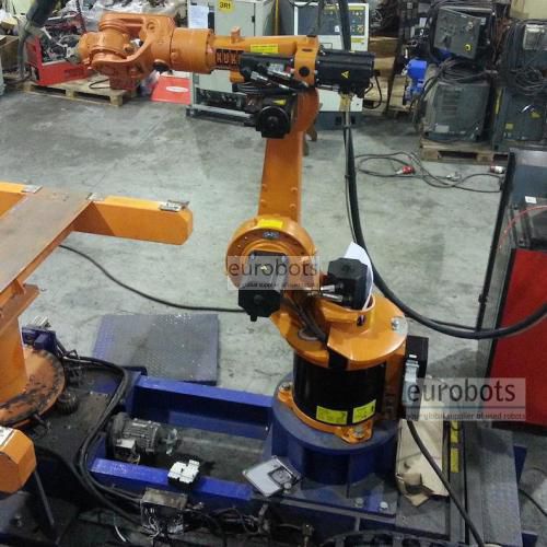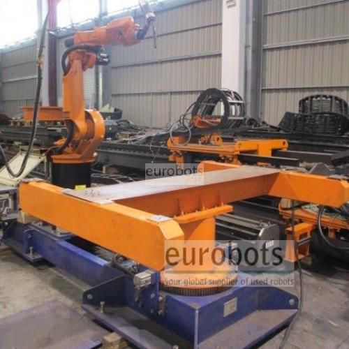Kuka KR15/2 year 2005 six axis industrial robot, 1500 mm horizontal arm reach equipped with a Fronius TPS4000 Synergic MIG/MAG arc welding power source (liquid cooled), wire feeder, torch cleaning station and a 180º turn automatic loading and unloading station, 400 Amperes power and wire thickness to choose between 0.8/1/1.2 mm. Special arc welding software A20 from Kuka. Software 5.2.9 under WinXP.